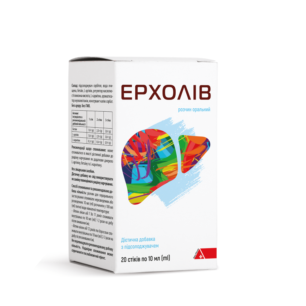 Ерхолів використовується в якості дієтичного фактору з метою підтримки нормального функціонування печінки, гепатобіліарної та серцево-судинної систем. Склад: підсолоджувач сорбітол, вода очищена, бетаїн, L-аргінін, регулятор кислотності лимонна кислота, L-карнітин, ароматизатор мультивітамін, консервант калію сорбат.