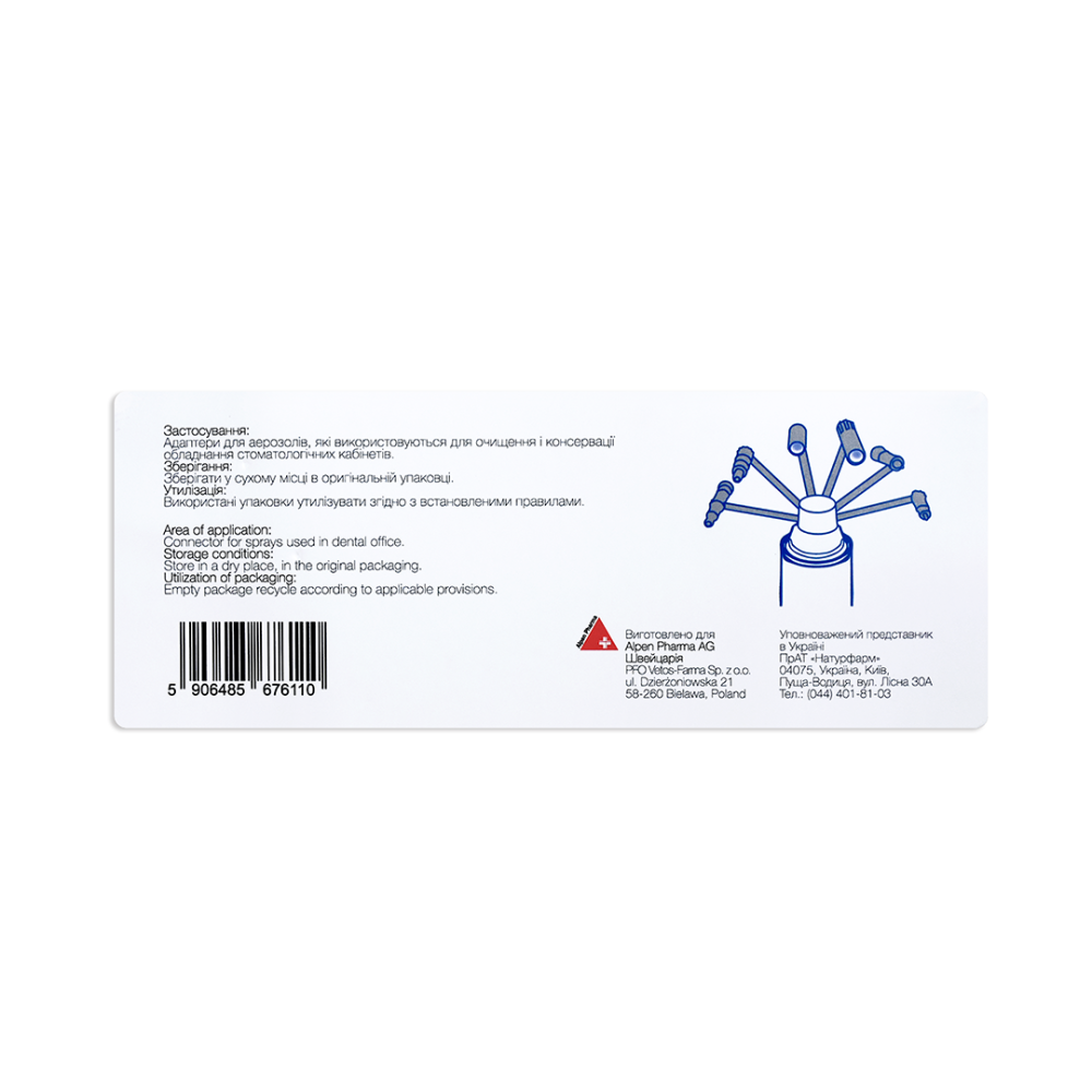 Адаптери для аерозолів, які використовують для очищення та консервації обладнання стоматологічних кабінетів.